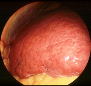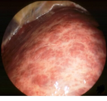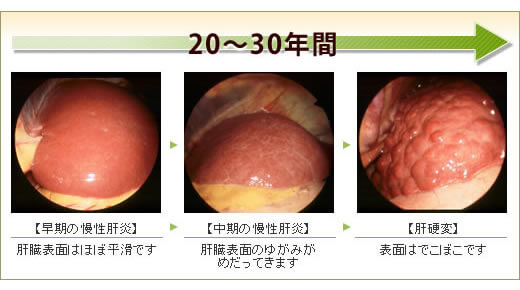 C型慢性肝炎とはC型肝炎ウイルスの感染が原因でおこる疾患です。C型肝炎ウイルスの感染からおおむね30年程度で徐々に慢性肝炎から肝硬変へと進行していきます。下の写真はおなかの中にいれたカメラ(腹腔鏡)で肝硬変に進行していく様子を見たものです。肝硬変になると表面がでこぼこになる様子が分かります。肝硬変になっても よほど進行しないと自覚症状はでませんが、年間約8%の確率で肝臓がんが発生しますので十分な注意が必要です。