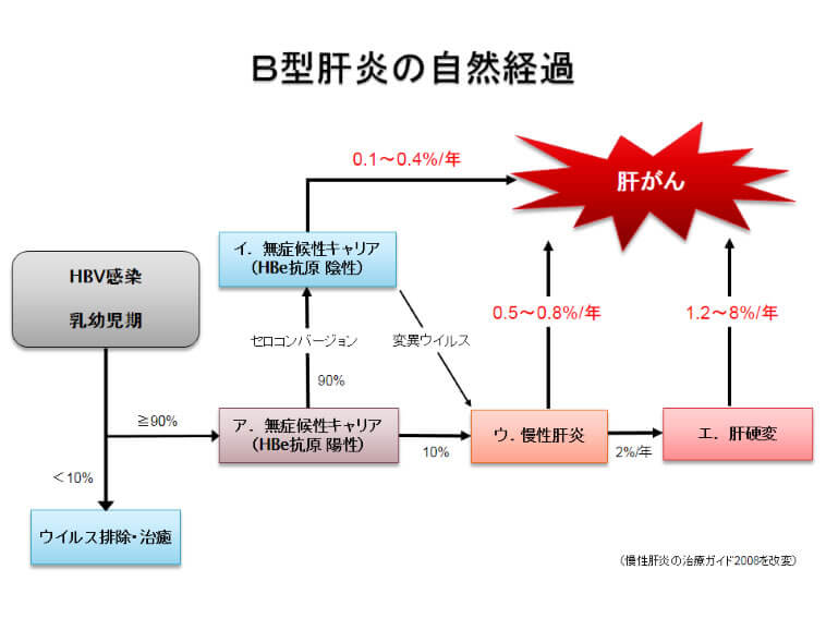 B型肝炎ウイルス(以下、HBV)は多くの場合、母子感染です。出産時や乳幼児期にHBV感染した方のうち、90%以上の方はHBe抗原陽性の無症候性キャリア(状態ア)となります。キャリアとは体内に持続的にウイルスが潜んでいる状態を言います。この状態の方はウイルス量が多く、現在は肝機能が正常であっても、急激に肝炎を起こす可能性を秘めている状態です。また性交渉などでパートナーにうつす危険も高いと言えます。